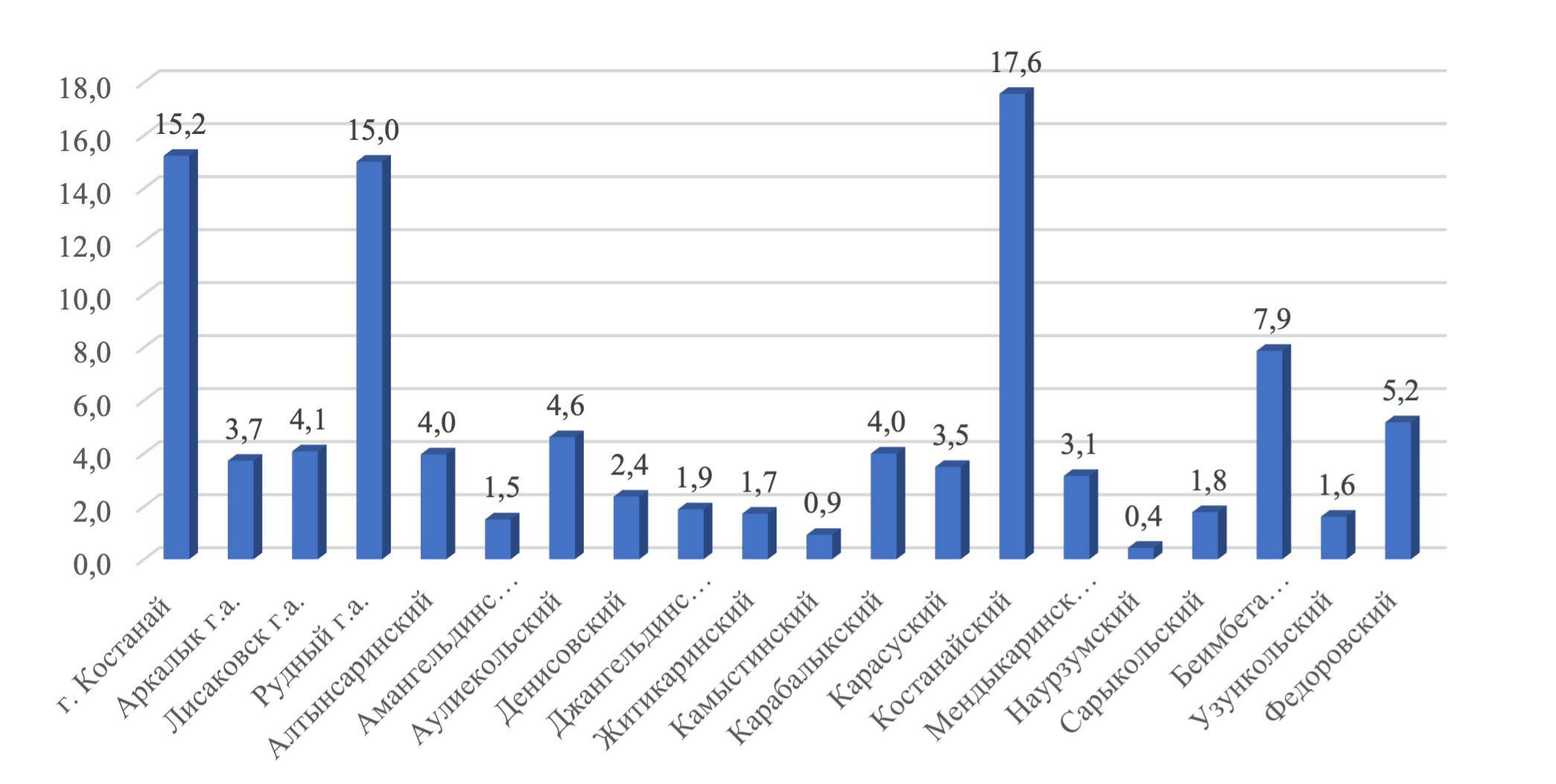 В состав Костанайской области входят 16 районов и 4 города. Рассмотрим долю каждого района в текущем производстве овощей (рисунок 1).