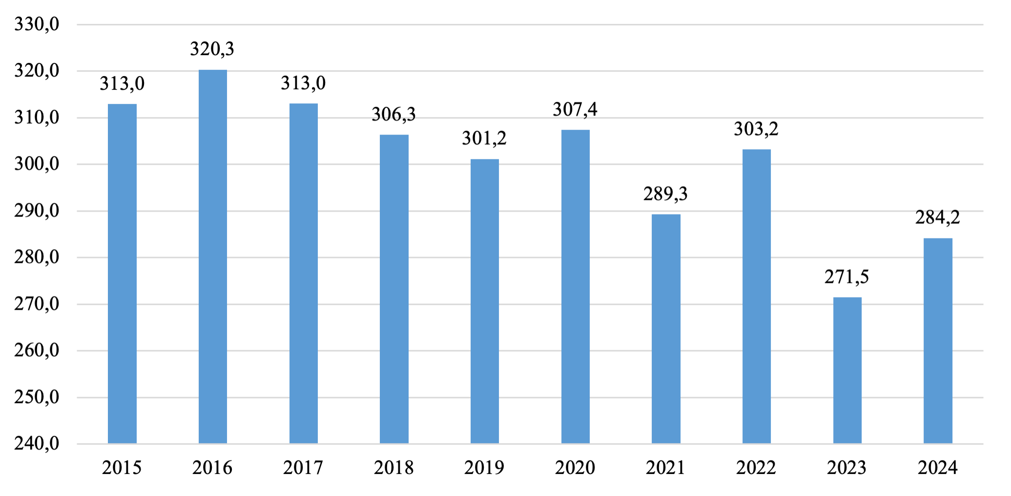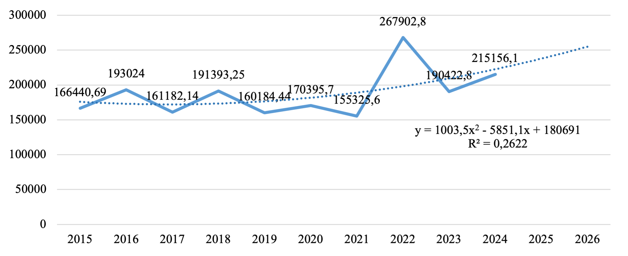 Показатель урожайности в исследуемом периоде достаточно волатилен и не позволяет выделить ни восходящие, ни нисходящие тренды. Так урожайность в периоде 2015–2017гг. относительно высокая и стабильная, колеблющаяся от 313 до 320,3 ц/га, что свидетельствует об успешности развития овощеводства в области. В периоде 2018–2021 гг. наблюдается постепенное снижение урожайности, которая достигает своего минимального уровня – 289,3 ц/га – в 2021 году. Этот период в сельском хозяйстве костанайского региона сопряжён с неблагоприятными погодными условиями. Далее следует период нестабильности: в 2022 году урожайность возрастает до 303,2 ц/га, однако в 2023 году снижается до 271,5 ц/га, что является самым низким показателем за весь рассматриваемый период. В 2024 году наблюдается некоторое восстановление урожайности до 284,2 ц/га, но она все еще остается ниже среднего уровня за весь период.