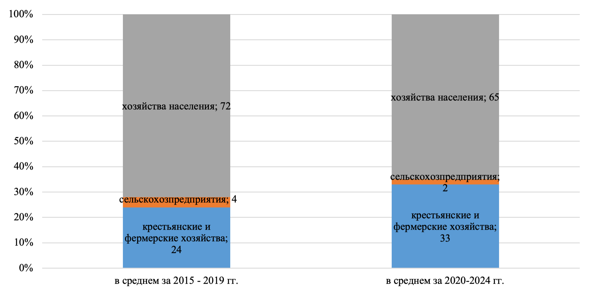 Если в период 2015–2019 гг. самая высокая урожайность зафиксирована в сельхозпредприятиях, то в период 2020–2024 гг. самую высокую урожайность продемонстрировали хозяйства населения, которых сохранили относительно стабильные показатели (снижение всего на 3,2%).