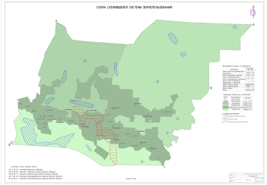 Тевризский муниципальный район располагается на севере Омской области. Занимая площадь 981,46 тыс. га, район относится к одному из самых крупных в области (Сайт администрации Тевризского муниципального района Омской области). Распределение земель района по категориям и основным угодьям представлено в таблицах 1 и 2 (Доклад о состоянии и использовании земель в Омской области в 2023 году).