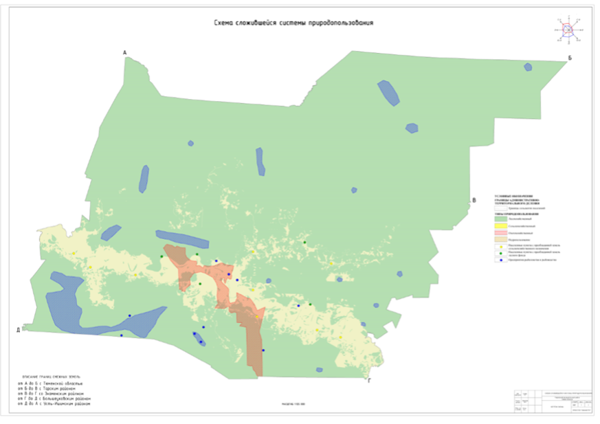 Для создания цифровой модели формировались новые информационные слои, включающие совокупность данных о природных ресурсах, землепользовании, природопользовании района. Для характери­стики природных ресурсов района в цифро­вой модели сформированы информацион­ные слои «почвенные ресурсы», «лесные ресурсы», «охотничьи ресурсы», «рыбные ресурсы», «месторождения полезных ископаемых». На рисунке 5 представлен информационный слой почвенные ресурсы. Характеристика системы землепользования включает данные по лесничеству, сельскохо­зяйственным организациям, закрепленным охотничьим угодьям, месторождениям, а система природопользования – данные по типам природопользования, сложившимся на территории района.